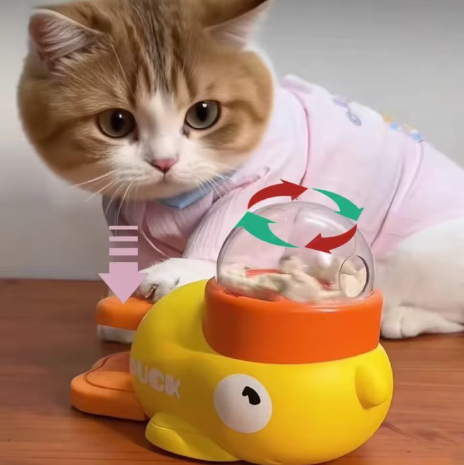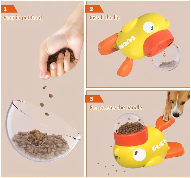 • Press-and-Release: The pet presses on the back or tail of the duck to get a small amount of food.